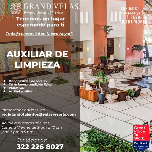 Grand Velas tiene vacantes en “Auxiliar de Limpieza”