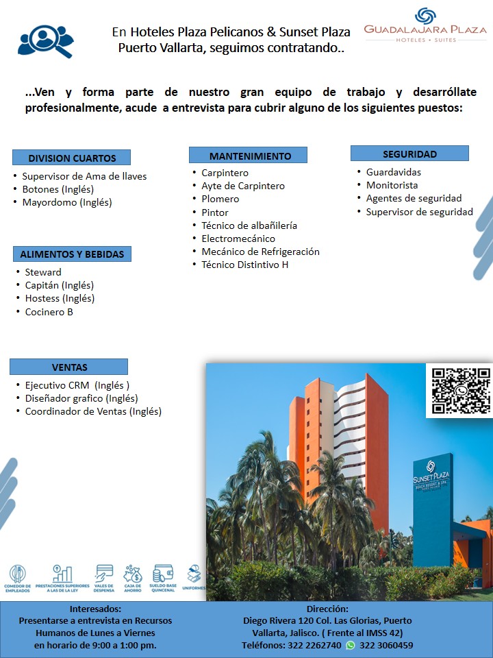 ¡Únete al equipo de Hoteles Plaza Pelicanos y Sunset Plaza Puerto Vallarta!